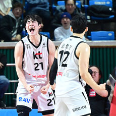2026.01.10 15: 413점슛 성공에 기뻐하는 KT 강성욱