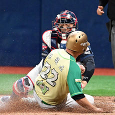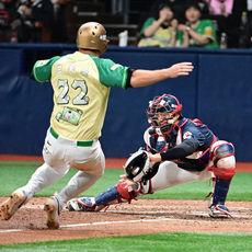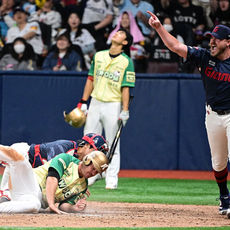 2026.04.11 18: 59레이예스, 홈으로 송구하며 3루주자 처리
