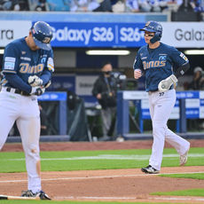 2026.04.11 18: 06득점 성공 하이파이브하는 박세혁과 양우현