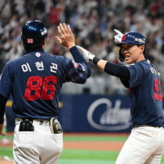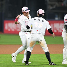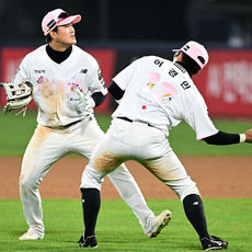 2026.04.11 19: 54허경민 '배정대와 승리 하이파이브'
