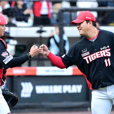 2026.04.12 17: 41마무리지은 KIA 조상우-한준수 배터리, '주먹을 쿵'