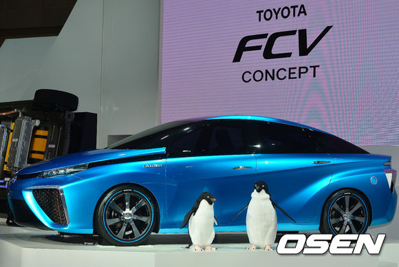 도쿄모터쇼에서 토요타의 2015년 시판 예정인 수소연료전지자동차 FCV(Fuel Cell Vehicle) 컨셉트카가 공개되고 있다.