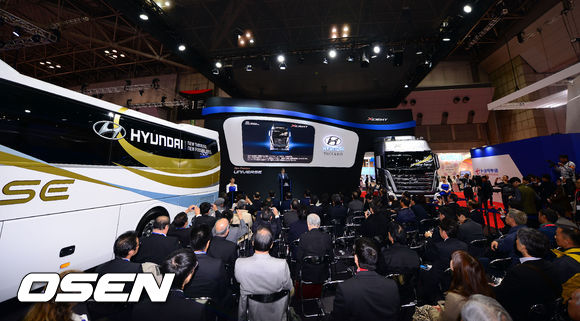 현대 상용차 부스에서 현대의 대형 트럭 '엑시언트'와 대형 버스 '유니버스'를 공개하고 있다.