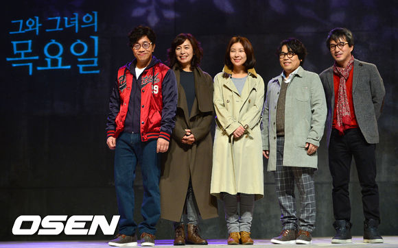 4일 오후 서울 대락로 대학로문화공간 필링에서 진행된 연극 '그와 그녀의 목요일' 앙코르 공연 프레스콜에서 배우 박철민과 유정아, 정재은, 정은표, 조재현이 포즈를 취하고 있다.