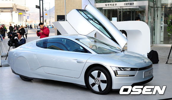 폭스바겐의 ‘1리터 차’ XL1이 10일 오전 서울 종로구 세종로 일민 미술관 앞에서 날렵한 모습을 드러내고 전국 9개 주요도시를 순회하는 로드쇼의 시작을 알렸다.