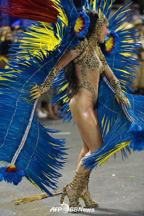[OSEN=사진팀] 3일(이하 현지시간) 브라질 리우데자네이루 삼보드로모에서 열린 카니발 퍼레이드 두 번째 밤에서 한 댄서가 공연하고 있다.