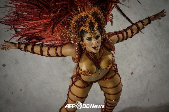 화려한 의상을 입은 여성 댄서가 삼바 리듬에 몸을 맡기고 있다. /< 사진 > ⓒAFPBBNews = News1
