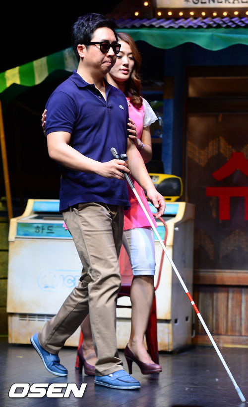 12일 오후 서울시 중구 충무아트홀 소극장 블루에서 열린 연극 '내 마음의 슈퍼맨' 프레스콜 행사, 이동우가 포토타임을 위해 무대를 받으며 황지영의 도움을 받아 입장하고 있다.