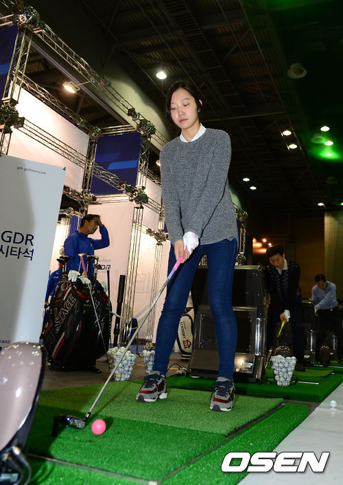 14일 오전 경기도 고양시 일산 킨텍스 제 1전시장에서 열린 '2014 SBS골프 대한민국 골프대전' 골프존 부스에서 골프연습 전용 시스템인 GDR을 통해 원포인트레슨을 받고 있다.
