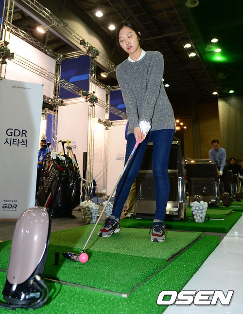 14일 오전 경기도 고양시 일산 킨텍스 제 1전시장에서 열린 '2014 SBS골프 대한민국 골프대전' 골프존 부스에서 골프연습 전용 시스템인 GDR을 통해 원포인트레슨을 받고 있다.