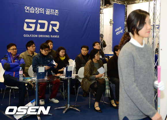14일 오전 경기도 고양시 일산 킨텍스 제 1전시장에서 열린 '2014 SBS골프 대한민국 골프대전' 골프존 부스에서 골프연습 전용 시스템인 GDR을 통해 원포인트레슨을 받고 있다.