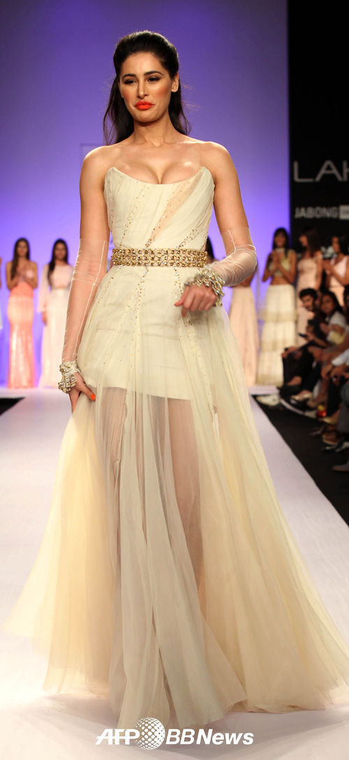 [OSEN=AFP 특약] 15일(현지시간) 인도 뭄바이에서 진행된 '라크메 패션위크'에서 인도 볼리우드 여배우 나르기스 파크리가 디자이너 Shehla Khan의 컬렉션을 선보이고 있다.