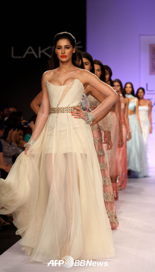 [OSEN=AFP 특약] 15일(현지시간) 인도 뭄바이에서 진행된 '라크메 패션위크'에서 인도 볼리우드 여배우 나르기스 파크리가 디자이너 Shehla Khan의 컬렉션을 선보이고 있다.