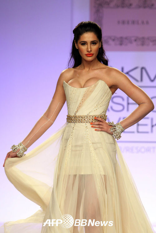 [OSEN=AFP 특약] 15일(현지시간) 인도 뭄바이에서 진행된 '라크메 패션위크'에서 인도 볼리우드 여배우 나르기스 파크리가 디자이너 Shehla Khan의 컬렉션을 선보이고 있다.