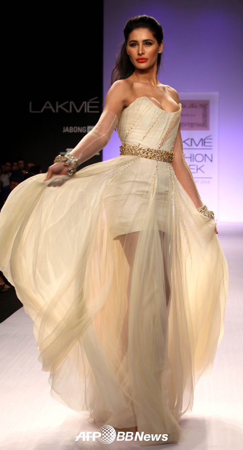 [OSEN=AFP 특약] 15일(현지시간) 인도 뭄바이에서 진행된 '라크메 패션위크'에서 인도 볼리우드 여배우 나르기스 파크리가 디자이너 Shehla Khan의 컬렉션을 선보이고 있다.