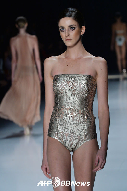 [OSEN=사진팀] 2일(현지시간) 브라질 상 파울로에서 열린 '상파울로 패션 위크(SPFW)' 아드리아나 디그리(Adriana Degreas) 2015 여름 컬렉션 무대에서 한 모델이 의상을 선보이고 있다.