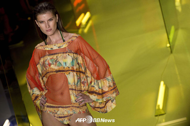 [OSEN=사진팀] 3일(현지시간) 브라질 상파울루에서 열린 '상파울루 패션 위크(SPFW)' 모비멘토(Movimento) 2015 여름 컬렉션 무대에서 한 모델이 의상을 선보이고 있다.