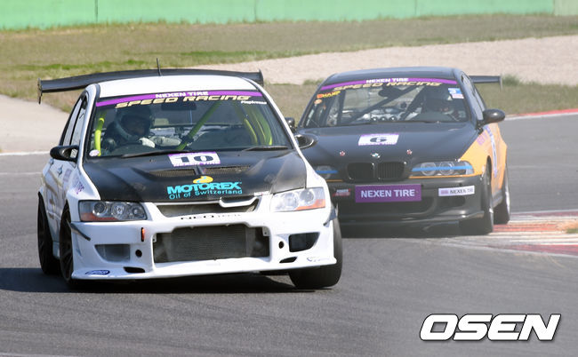 경기에 참가한 이정훈(10번),문은일(6번) 카레이서가 곡선 구간을 통과하고 있다.