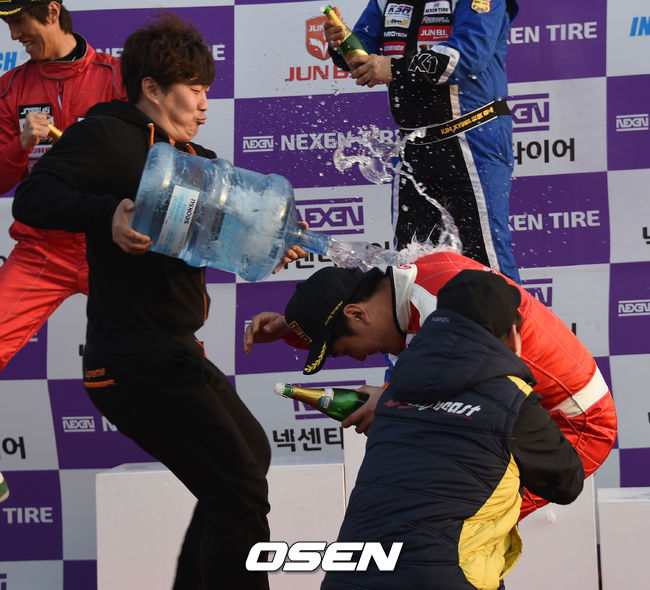 V-Kool 챌리지 수상자 박경석(3위)이 시상식이 끝나후 동료들로 부터 물벼락 세리머니를 받고 있다.