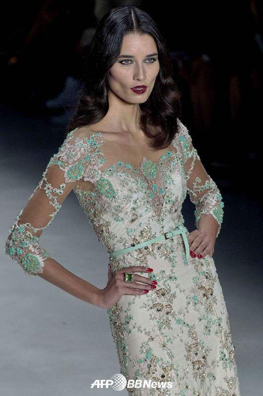 상파울루 패션위크,'우아한 에메랄드빛 드레스와 도발적인 눈빛'