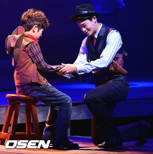 16일 오후 서울 강남구 신사동 BBC아트센터 BBC홀에서 열린 뮤지컬 '보니 앤 클라이드' 미디어콜, 클라이드 역의 박형식이 어린 클라이드 역을 맡은 이준서와 공연을 펼치고 있다.