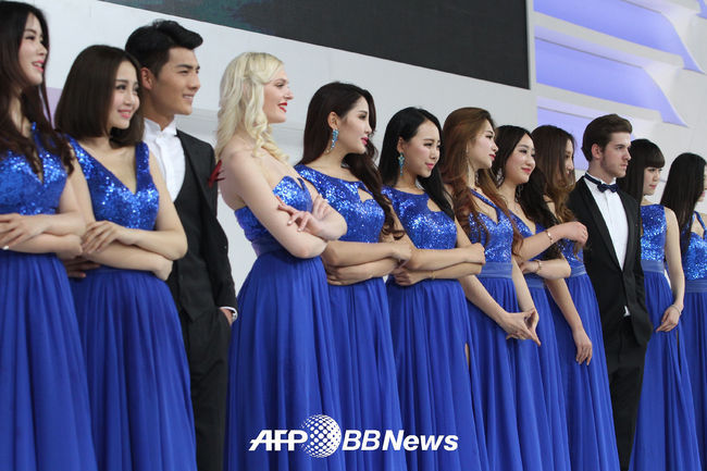 [OSEN=사진팀] 21일(현지시간) 중국 베이징에서 중국 신국제전람중심에서 열린 '오토차이나 2014 (Auto China 2014-Beijing International Automotive Exhibition)'서 모델들이 모여 포즈를 취하고 있다.