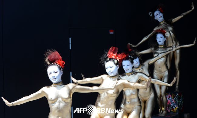 [OSEN=사진팀] 27일(현지시간) 일본 도쿄에서 일본의 부토 무용단 '다이라쿠다칸' 소속 댄서들이 일본 도쿄의 '고엔지 거리 퍼포먼스 축제'에서 화려한 무대를 선보이고 있다. / < 사진 > ⓒAFPBBNews = News1, 무단전재 및 재배포 금지