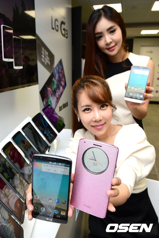 28일 오전 서울 여의도 LG트윈타워에서 'LG G3' 공개 미디어브리핑 행사가 열린 가운데 모델들이 제품을 선보이고 있다.