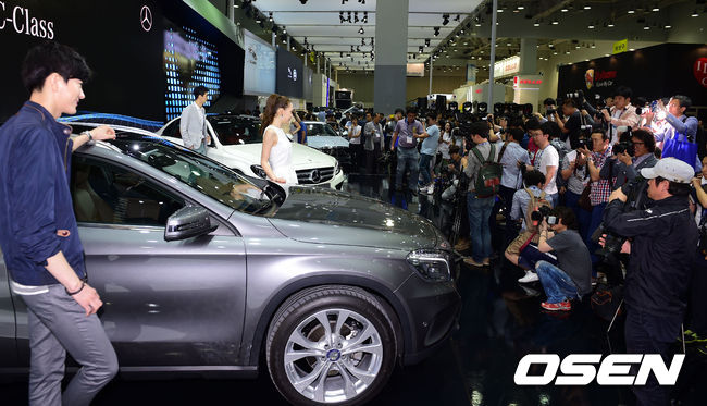 29일 부산 벡스코에서 열린 '2014 부산 모터쇼' 프레스데이 행사 벤츠 부스에서 수많은 취재진들이 신차를 카메라에 담고 있다.