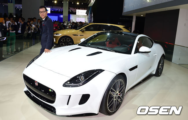 29일 부산 벡스코에서 열린 '2014 부산 모터쇼' 프레스데이 행사 재규어 부스에서 가수 김진표가 포즈를 취하고 있다.