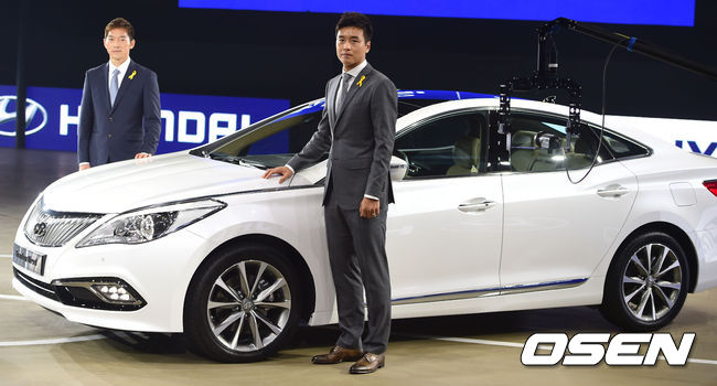 29일 부산 벡스코에서 열린 '2014 부산 모터쇼' 프레스데이 행사 현대자동차 부스에서 축구선수 이동국과 김남일이 포즈를 취하고 있다.
