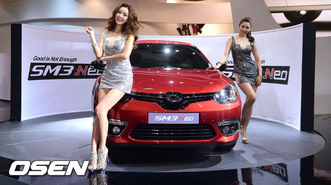 29일 부산 벡스코에서 열린 '2014 부산 모터쇼' 프레스데이 행사, 르노 삼성 자동차 부스에서 레이싱모델 정주미와 이은혜가 포즈를 취하고 있다.