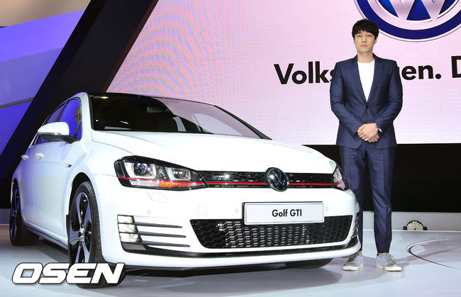29일 부산 벡스코에서 열린 '2014 부산 모터쇼' 프레스데이 행사, 폭스바겐 부스에서 배우 소지섭이 포즈를 취하고 있다.