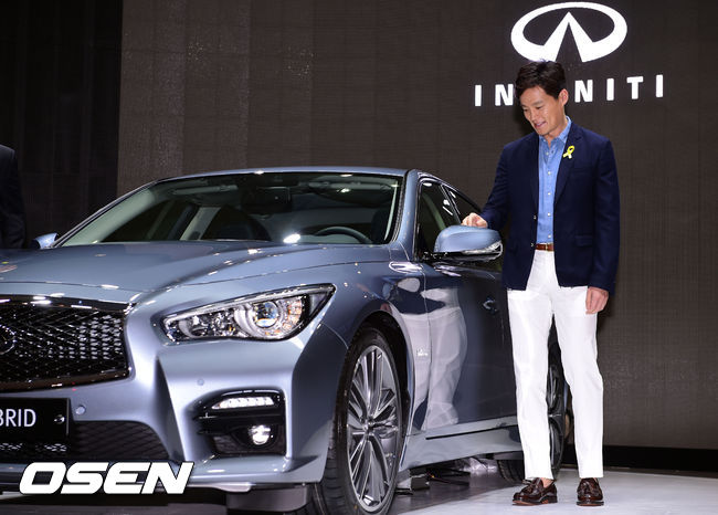 29일 부산 벡스코에서 열린 '2014 부산 모터쇼' 프레스데이 행사, 인피니티 부스에서 인피니티 홍보모델 이서진이 Q50을 선물 받은 뒤 미소 짓고 있다.