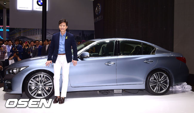 29일 부산 벡스코에서 열린 '2014 부산 모터쇼' 프레스데이 행사, 인피니티 부스에서 인피니티 홍보모델 이서진이 Q50을 선물 받은뒤 포즈를 취하고 있다.