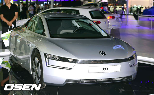 29일 부산 벡스코에서 열린 '2014 부산 모터쇼' 프레스데이 행사, 폭스바겐 부스에서 플러그인 디젤 하이브리드 콘셉트카 'XL1'이 전시되어 있다. XL1은 48마력 2기통 TDI엔진과 27마력 전기모터로 1리터 111km 주행 가능하다. 연내 유럽시장에 시판될 예정이다.