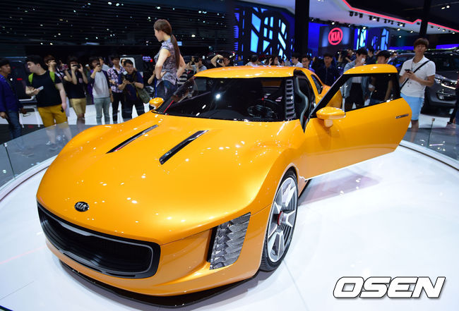 30일 부산 벡스코에서 열린 '2014 부산 모터쇼', KIA 자동차 부스에 콘셉트카 GT4 스팅어가 전시되어 있다. GT4 스팅어 콘셉트카는 미국 디자인센터에서 후륜 구동 스포츠카로 개발한 기아차의 10번째 콘셉트카다.