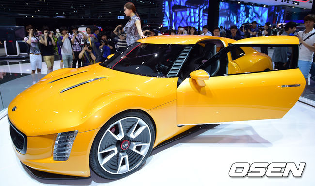 30일 부산 벡스코에서 열린 '2014 부산 모터쇼', KIA 자동차 부스에 콘셉트카 GT4 스팅어가 전시되어 있다. GT4 스팅어 콘셉트카는 미국 디자인센터에서 후륜 구동 스포츠카로 개발한 기아차의 10번째 콘셉트카다.