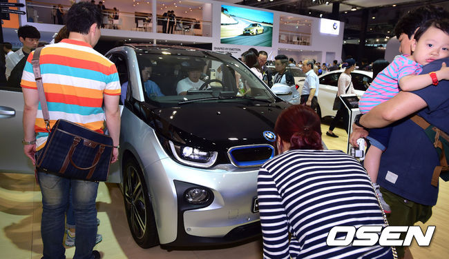 30일 부산 벡스코에서 열린 '2014 부산 모터쇼', BMW 부스에서 전기차 BMW i3가 전시되어 있다.