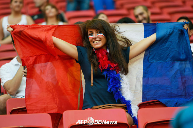 [OSEN=사진팀] 1일(한국시간) 브라질리아의 에스타디오 나시오날에서 진행된 '2014 브라질 월드컵' 프랑스와 나이지리아의 16강전 경기에 앞서 프랑스 축구팬이 열띤 응원을 하고 있다.