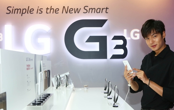 LG전자의 중국 광고모델인 배우 이민호가 중국 출시행사장에서 'LG G3'를 체험해 보고 있다.