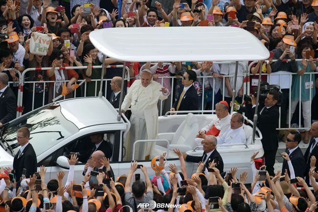 방한 사흘째인 프란치스코 교황이 16일 오전 10시 124위의 순교자들이 천주교 복자로 시성되는 시복미사를 열었다. 교황은 시복식 직전 카퍼레이드를 갖고 신도들은 만났다.