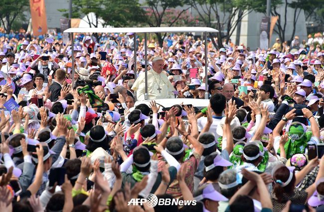 방한 사흘째인 프란치스코 교황이 16일 오전 10시 124위의 순교자들이 천주교 복자로 시성되는 시복미사를 열었다. 교황은 시복식 직전 카퍼레이드를 갖고 신도들은 만났다.