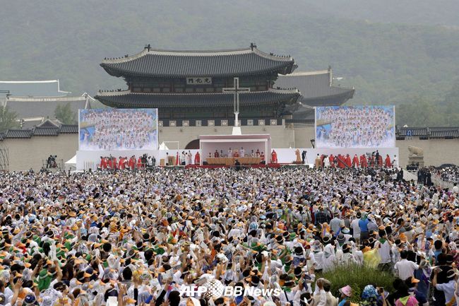 방한 사흘째인 프란치스코 교황이 16일 오전 10시 124위의 순교자들이 천주교 복자로 시성되는 시복미사를 열었다. 교황은 시복식 직전 카퍼레이드를 갖고 신도들을 만났다.