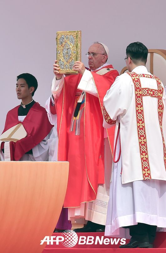 방한 사흘째인 프란치스코 교황이 16일 오전 10시 124위의 순교자들이 천주교 복자로 시성되는 시복미사를 열었다. 교황은 시복식 직전 카퍼레이드를 갖고 신도들을 만났다.