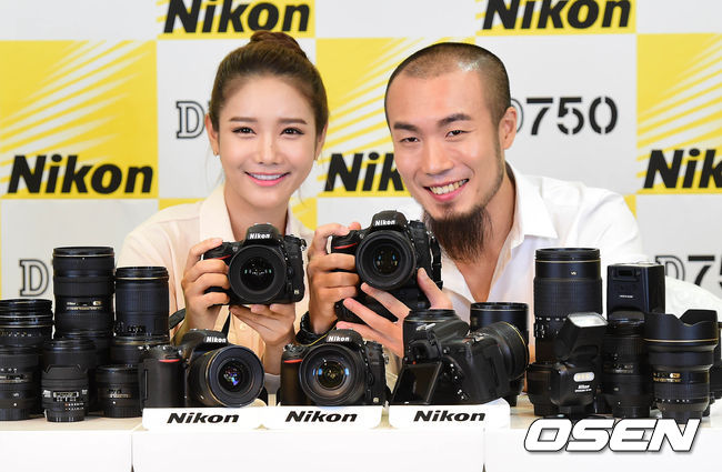 12일 오후 서울 중구 코리아나호텔에서 열린 니콘의 신형 DSLR 카메라 D750 발표 행사에서 손스타와 모델이 포즈를 취하고 있다.