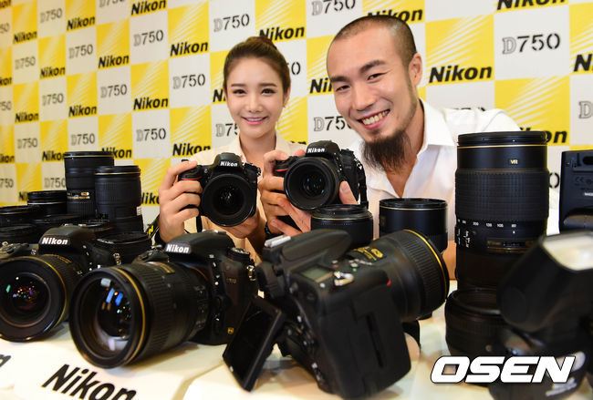 12일 오후 서울 중구 코리아나호텔에서 열린 니콘의 신형 DSLR 카메라 D750 발표 행사에서 손스타와 모델이 포즈를 취하고 있다.