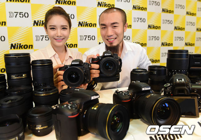 12일 오후 서울 중구 코리아나호텔에서 열린 니콘의 신형 DSLR 카메라 D750 발표 행사에서 손스타와 모델이 포즈를 취하고 있다.