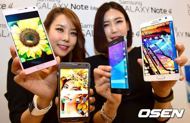 모델들이 갤럭시 노트4와 갤럭시 노트 엣지를 들고 포토타임을 갖고 있다.
