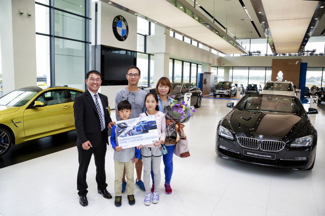 장성택 BMW 드라이빙 센터장(왼쪽)이 1만 번째 내방객 이영준 씨 가족에게 축하 화환을 전달하고 기념촬영을 하고 있다.